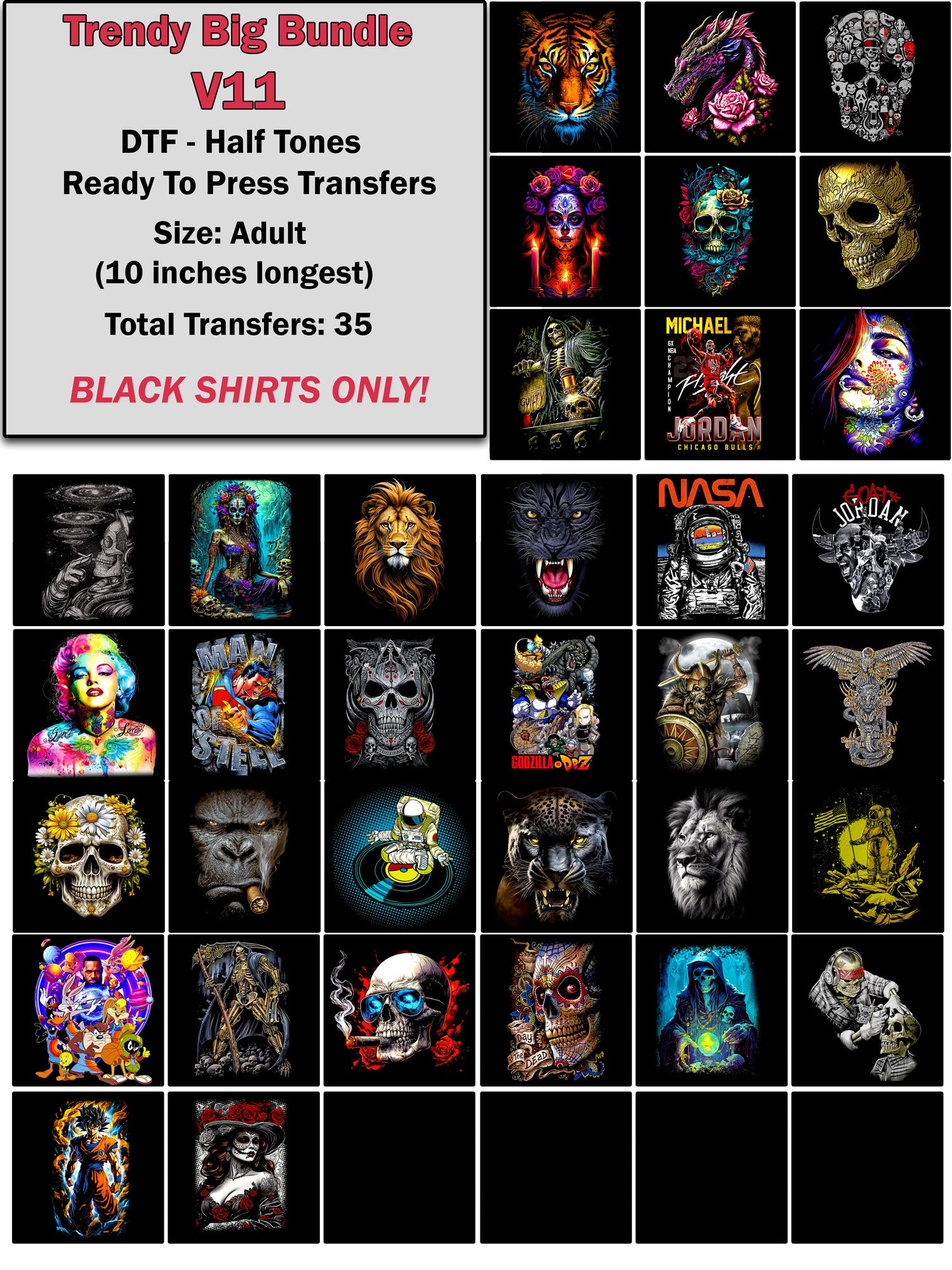 Press full-color, complex images to any color shirt and any material using our DTF (direct-to-film) transfers. The result is a soft and durable design you can achieve quickly and easily. No cutting, weeding or layering required.